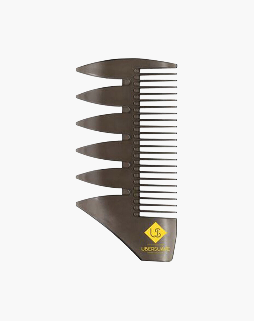 "The Shuriken" comb by Ubersuave made with Tough, break-resistant Thermoplastic resin material. The makers have spent huge amounts of time learning and refining this beauty to get it to where it's one of the finest compact comb available. The shark toothed face makes for easy combing, effortlessly creating the hot favorite bed head quiff separation hair style. The other fine toothed face functions as a regular comb, capable of destroying all hair tangles.
