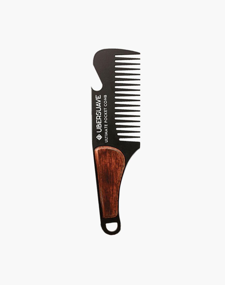 The Ubersuave Ultimate Pocket Comb in Stainless Zinc alloy metal with HQ Blood Sandalwood handles. The makers have spent huge amounts of time learning and refining this beauty to get it to where it's one of the finest metal combs available. The surface of the comb has been sandblasted to a full black matte finish. This fine toothed comb is indestructible with normal use even in tactical terrains and environments.